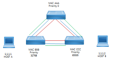 1. 망의 회선이 모두 연결되어있습니다. Switch A,B,C는 모두 자기자신을 ROOT SWITCH 로 광고합니다.